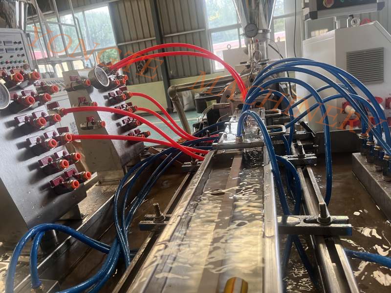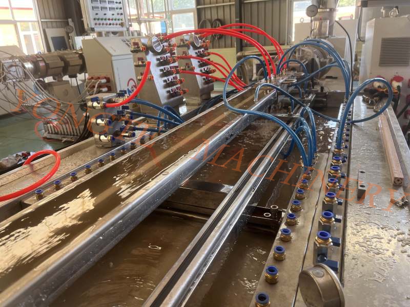 En réponse aux points de douleur de l'industrie ci-dessus, les machines en plastique Yongte s'appuient sur l'accumulation deÉquipement d'extrusion de câble PVCRecherche et développement pour réaliser l'optimisation des processus en cours à travers les percées de la technologie de base. En termes de système d'extrusion, une extrudeuse à double vis avec un rapport longueur / diamètre de 25: 1 est utilisée, avec une conception de rapport de compression de 2,5 à 3: 1, et équipée d'un système de contrôle de température intelligent PID pour contrôler la précision de contrôle de la température à ± 1 ° C, assurant une plastification uniforme uniforme du système multi-composantes PVC et évitant le risque de décomposition thermique; L'épaisseur de la couche de placage chromée sur la surface de la vis est ≥20 μm, et le canon est tapissé d'alliage de carbure de tungstène pour améliorer la corrosion et l'usure de la résistance de l'équipement. Le système de moisissure utilise un logiciel d'analyse de flux de moisissure pour optimiser le canal d'écoulement pour réaliser l'écart de l'épaisseur de la paroi à ± 0,1 mm; Le corps du moule est en acier inoxydable 4CR13 et complété en traitement de revêtement PVD, et est équipé d'un capteur de pression de haute précision pour contrôler la fluctuation de la pression à ≤5%, prolongeant efficacement la durée de vie du moule. Le stade de refroidissement et de mise en forme adopte une structure de refroidissement à trois niveaux, la pression négative du moule de mise en forme du vide est maintenue à -0,06 à -0,08 MPa, la différence de température de refroidissement du réservoir d'eau de refroidissement est contrôlée à ≤3 ° C, et un contrôle précis de la température est utilisé pour éviter la déformation du profil. De plus, l'équipement intègre également un certain nombre de technologies intelligentes. Le mécanisme de traction utilise le service de servo pour faire de la fluctuation de tension ≤ 1%, la précision de positionnement du dispositif de coupe CNC atteint ± 1 mm, le système de mélange et de séchage contrôle la teneur en humidité des matières premières ≤0,03% et l'unité de traitement de protection de l'environnement atteint le taux d'élimination de HCL ≥95%. Grâce au système de contrôle intégré PLC et à la plate-forme de surveillance des données, l'ajustement en temps réel et la surveillance dynamique des paramètres de l'ensemble du processus de production sont réalisés.